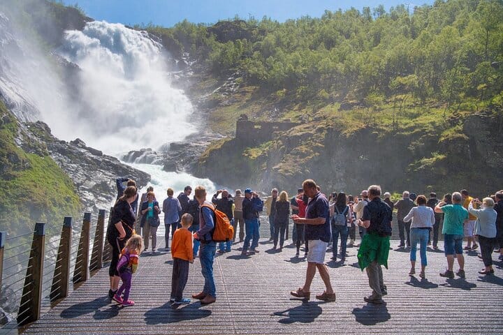 Start your journey in Bergen with a scenic train ride on the world-renowned Bergen Railway, heading toward the adventure capital of Norway—Voss. From there, continue by bus through charming villages and dramatic landscapes en route to the historic Viking village of Gudvangen.